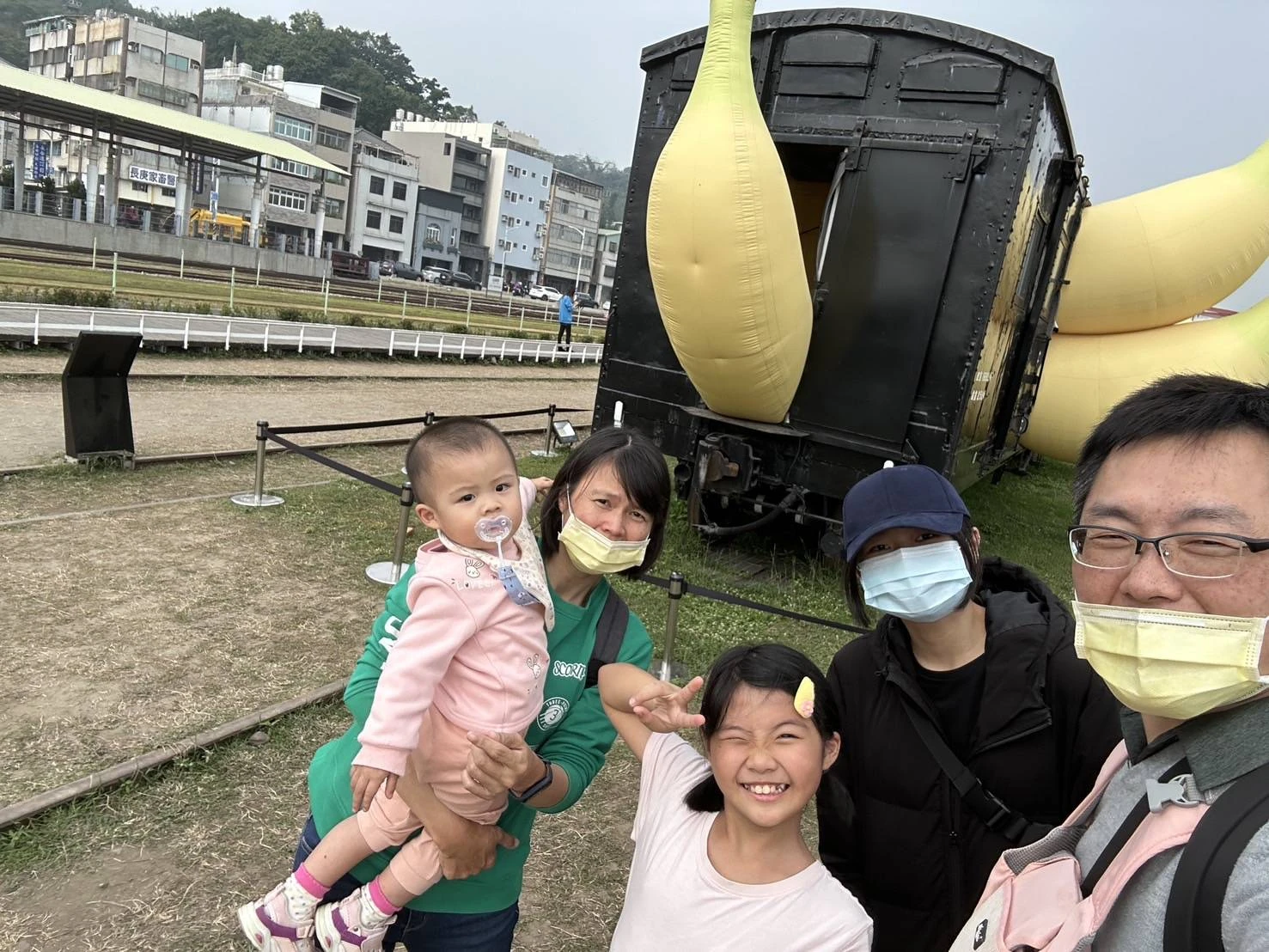 ▲恩汝(中)、慧芬姐(右2)、陳副理(左2)、職業安全衛生人員李政德(左1)與工地主任翁明偉(右1)於海景安居二期工地合影