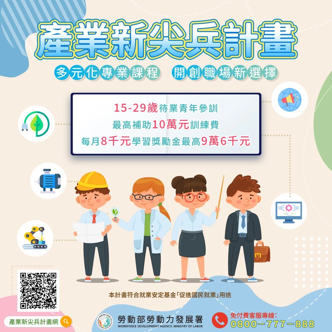 隨著數位科技崛起及產業結構轉型,帶動相關產業專業人才需求,為了協助15歲至29歲年輕朋友掌握產業發展與職場未來趨勢,勞動部推出「產業新尖兵計畫」,專為失待業青年設計,提供多元領域的專業訓練課程,補助最高10萬元的訓練費,並提供每月高達8千元的學習獎勵金,114年已有176門最新課程上架,歡迎青年踴躍報名參訓。